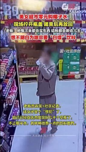 近日,江苏常州一女子在超市里“白嫖”饮料,现场拧开瓶盖,喝完后再放回去。 超市老板回应,该女子是个“惯犯”了,自己已经在店内发现好几十个空瓶,不止椰子水,还有贵一点的饮料。据超市收银员,该女子每次来都会买东西,结账都会聊会天,想不明白为啥要“白嫖”饮料。目前已报警。来源:国+社区、纵览新闻举报/反馈