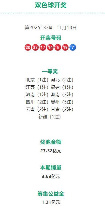 双色球第2025133期中出一等奖21注,筹集公益金1.31亿元。