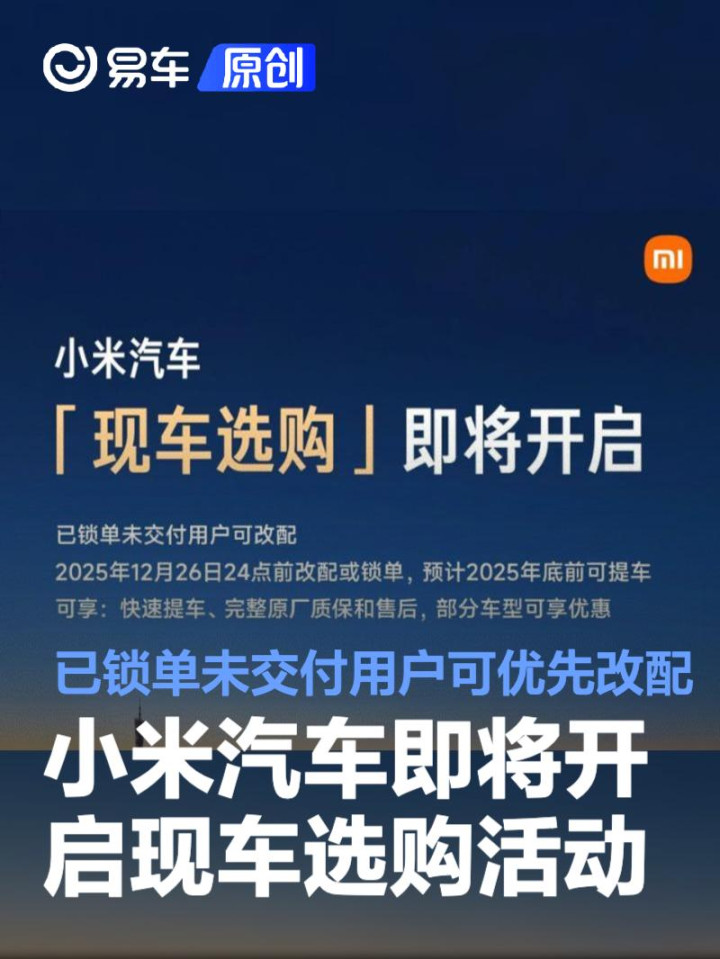 具体流程为,2025年12月1日12点起,已锁定订单、未交付、且在开票流程前的小米SU7、小米SU7Ultra(含选配赛道专业套装)或小米YU7用户可优先改配同车型「现车」。「小米定制服务」车型不参与此次「现车选购」。同时请您注意,改配到「现车」,您需要同时满足以下条件:购买「现车」的下单人米ID账号须与已锁定订单的下单人米ID账号保持一致;「现车」订单的上牌人信息须与已锁定订单的上牌人信息保持一致。2025年12月3日10点起,「现车选购」将面向所有用户开放。