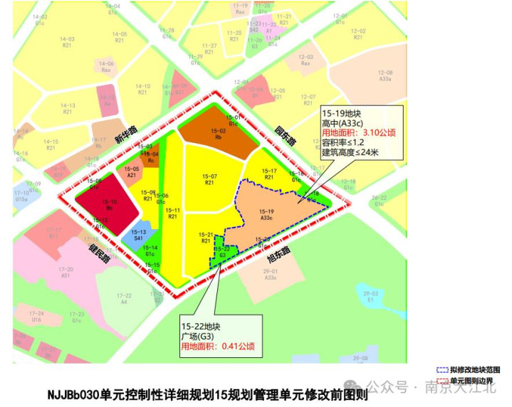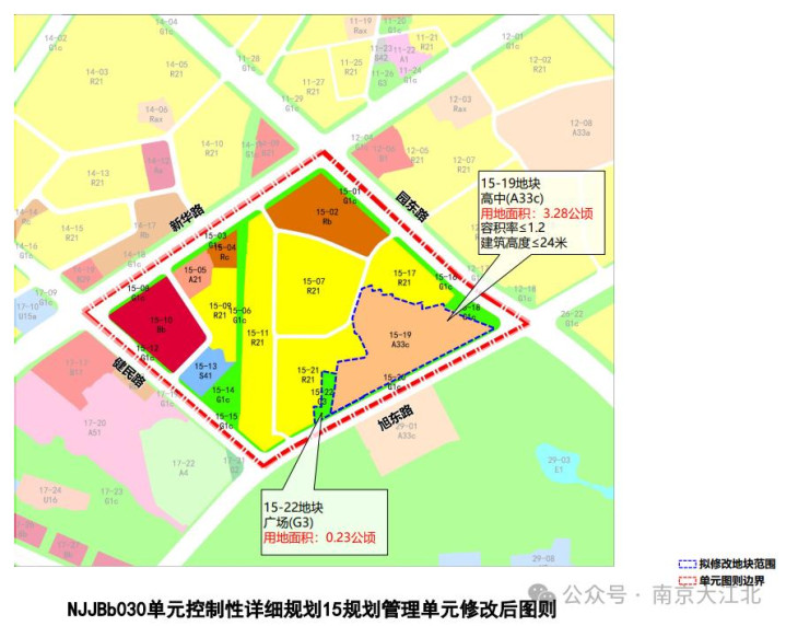 本次拟修改的NJJBb030-15规划管理单元,地处大厂街道核心地段,四至范围清晰:东至旭东路,西至新华路,南至健民路,北至园东路,总面积约25.03公顷,涵盖了大厂高级中学及周边配套区域。